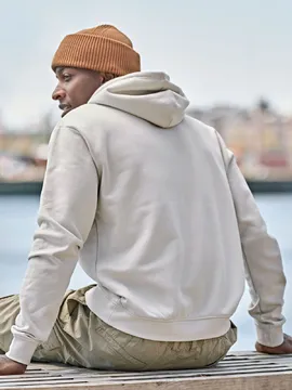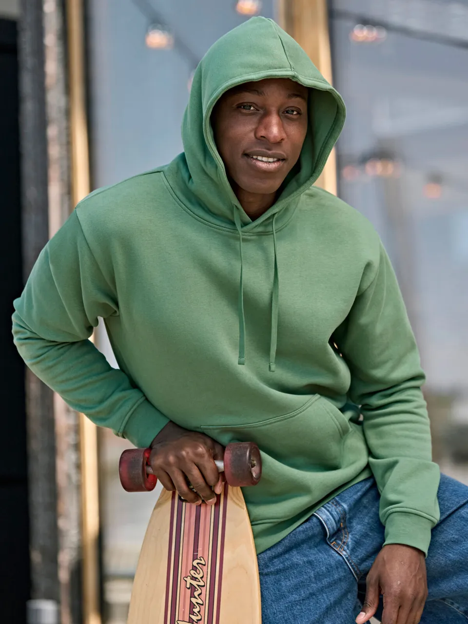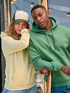 Felpa con cappuccio dal design ricercato, perfetta per personalizzazioni professionali. Realizzata in blend certificato 70% cotone biologico ring-spun pettinato e 30% poliestere riciclato con grammatura 300 g/m², offre una base resistente ideale per stampa e ricamo sul pannello mezzaluna. Il tessuto three-ply spazzolato internamente e il doppio prelavaggio garantiscono comfort termico superiore e stabilità dimensionale ai lavaggi intensi, mentre le costine con elastan assicurano tenuta e resistenza nel tempo. Un capo premium per merchandising aziendale, workwear o collezioni streetwear, che unisce certificazioni sostenibili e durabilità.